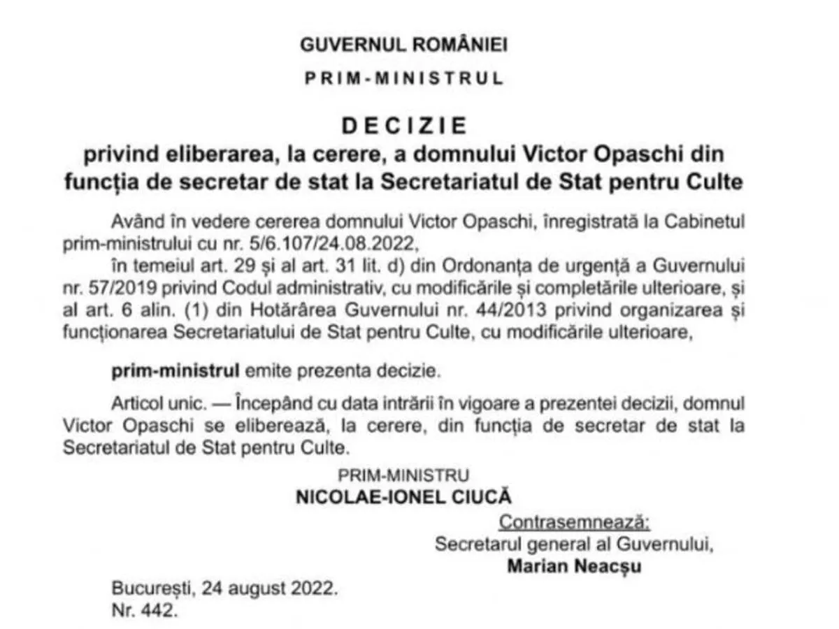 Victor Opaschi a fost eliberat, la cerere, din funcţia de secretar de stat la Secretariatul de Stat pentru Culte, printr-o decizie a prim-ministrului Nicolae Ciucă.