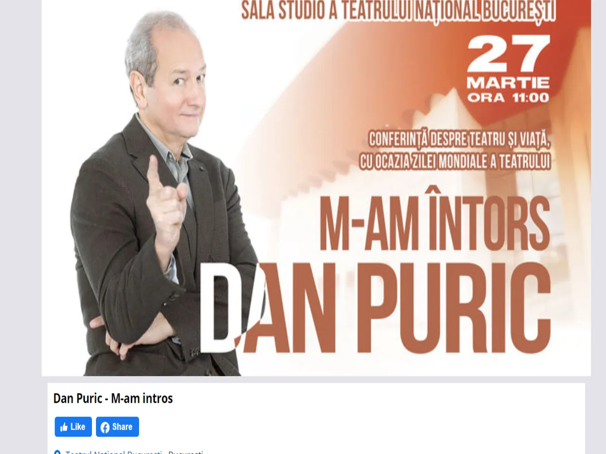 „M-am întors”, spectacolul-conferință al artistul și regizorului Dan Puric va avea loc la Sala Studio a Teatrului Național din București , în data de 27 martie 2022, cu incepere de la ora 11.00. Ziua de 27 martie are o semnificație aparte, fiind Ziua Mondială a Teatrului. Instituită în 1961, de Institutul Internaţional de Teatru (ITI), această zi a devenit un eveniment anual din 1962, organizat de centrele ITI şi comunitatea internaţională de teatru, se arată în prezentare.