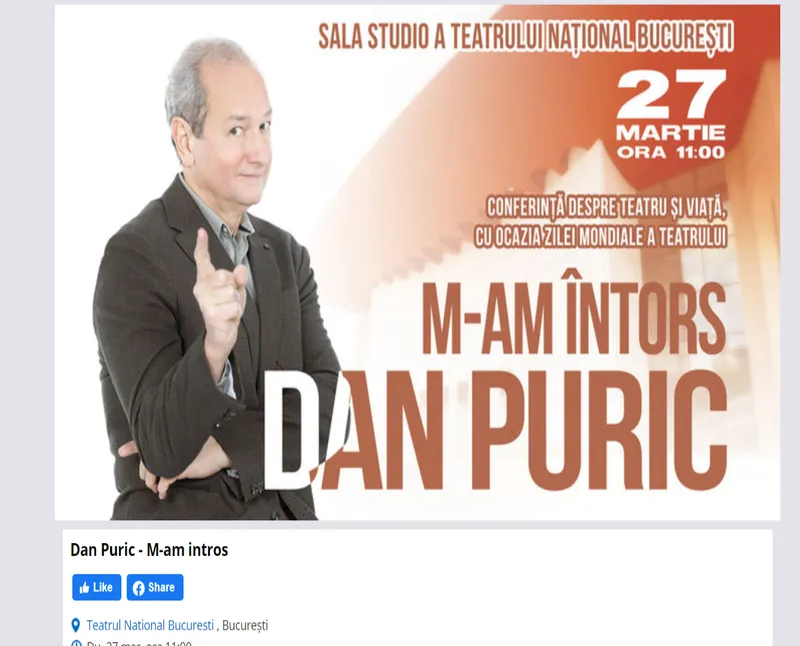 Pe 27 martie, Teatrul Național găzduiește conferința „Dspre teatru și viață” a lui Dan Puric. Prețul biletelor variază între 60 și 80 de lei.