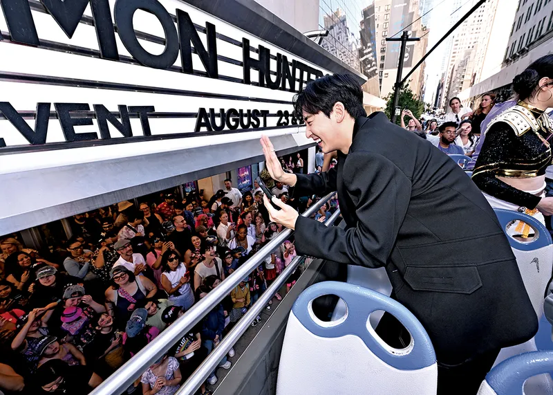 Kevin Woo, care împrumută vocea sa pentru Mystery Saja, la o experiență Sing-Along KPop Demon Hunters la Paris Theater din New York City, pe 23 august