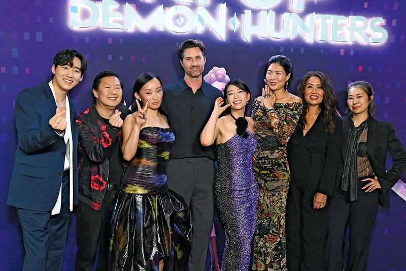 ÎN PRIM-PLAN Appelhans (în centru) și Kang (în extrema dreaptă) sunt însoțiți de distribuția filmului KPop Demon Hunters la o proiecție specială în Los Angeles, în iunie