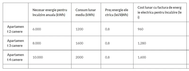 Necesarul de energie pentru încălzire anuală (kWh) și costul lunar al energiei electrice pentru încălzire