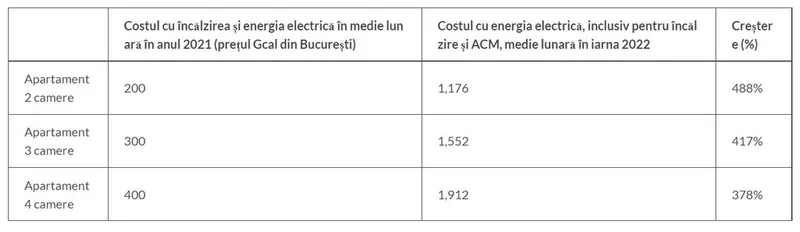 Costul mediu lunar cu încălzirea și energia electrică în anul 2021 (prețul Gcal din București) și costul cu energia electrică, inclusiv pentru încălzire și ACM, medie lunară în iarna 2022