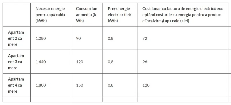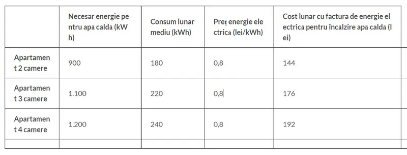 Necesarul de energie pentru apă caldă (kWh) și costul lunar al energiei electrice exceptând costurile cu energia pentru a produce căldură