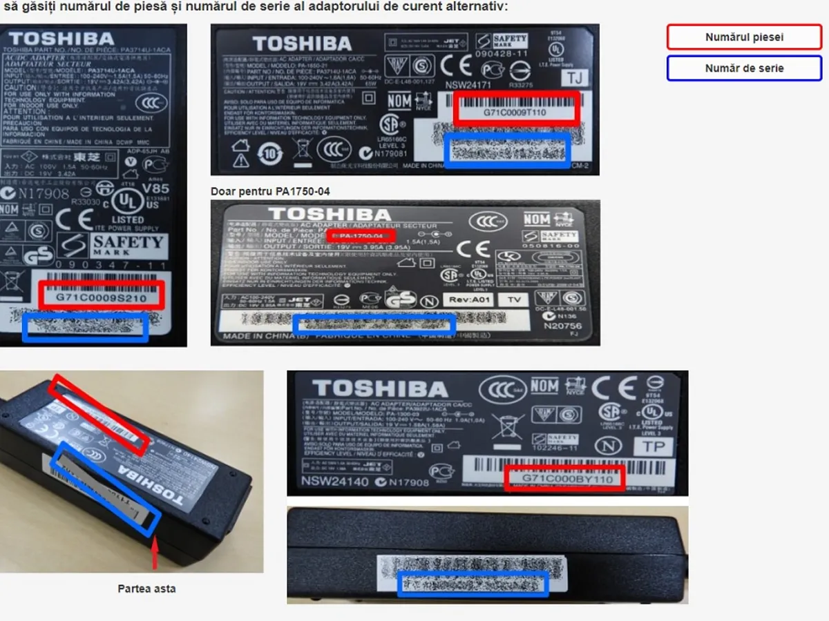 R: Anumite adaptoare de curent alternativ vândute cu laptopuri Toshiba sau ca accesorii separate care au fost fabricate din aprilie 2008 până în decembrie 2012 (vândute între aprilie 2008 și aprilie 2014) pot face obiectul retragerii. Numerele de model ale adaptoarelor AC potențial afectate sunt enumerate mai sus.