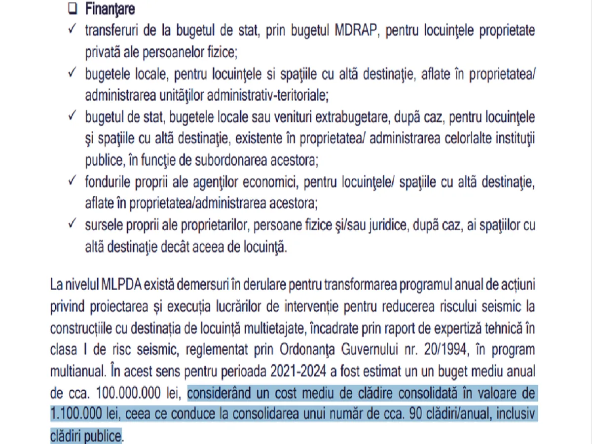 „La nivelul MLPDA există demersuri în derulare pentru transformarea programul anual de acțiuni privind proiectarea și execuția lucrărilor de intervenție pentru reducerea riscului seismic la construcțiile cu destinația de locuință multietajate, încadrate prin raport de expertiză tehnică în clasa I de risc seismic, reglementat prin Ordonanţa Guvernului nr. 20/1994, în program multianual. În acest sens pentru perioada 2021-2024 a fost estimat un un buget mediu anual de cca. 100.000.000 lei, considerând un cost mediu de clădire consolidată în valoare de 1.100.000 lei, ceea ce conduce la consolidarea unui număr de cca. 90 clădiri/anual, inclusiv clădiri publice”, arată documentul.