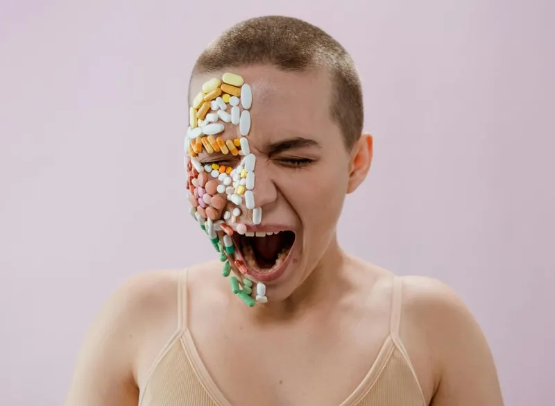 Femeie cu medicamente de diferite tipuri lipite de partea dreaptă a feţei - Foto: Pexels/cottonbro studio