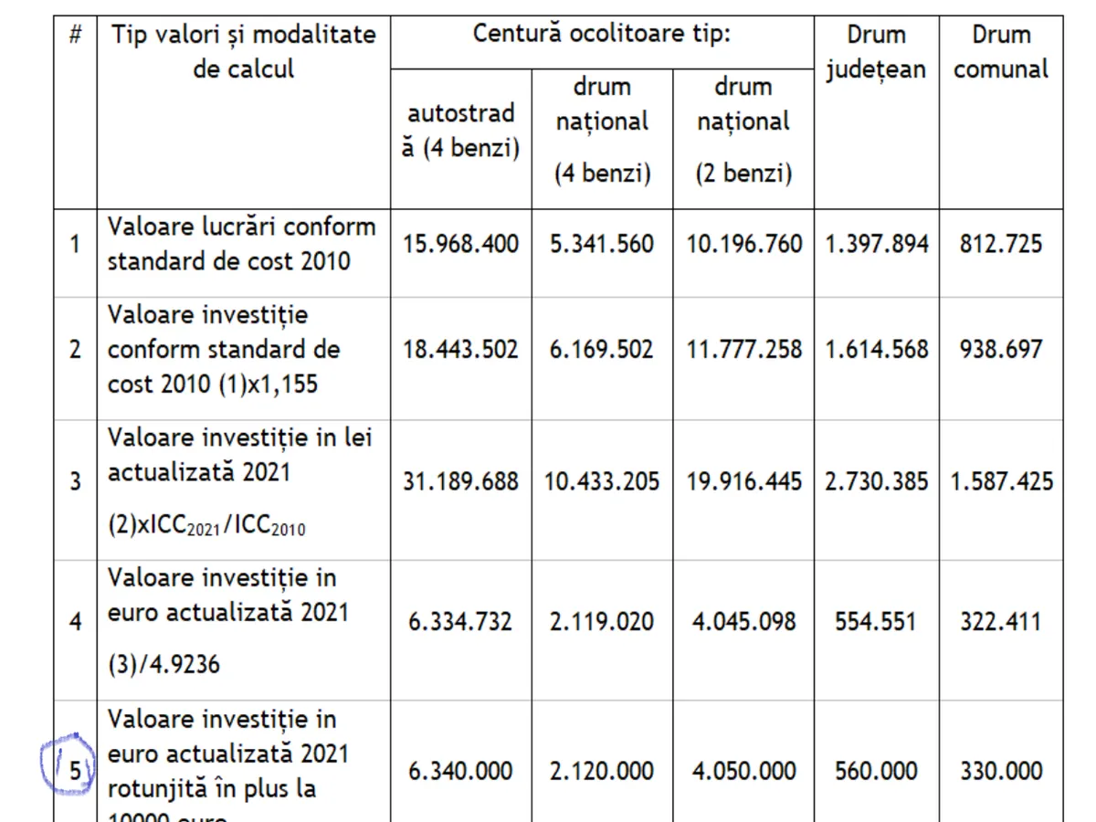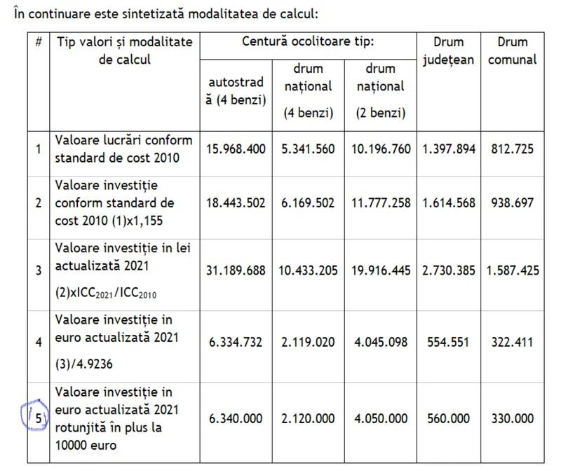 „Standardele de cost în euro/km pentru drum comunal, drum județean și centuri ocolitoare au fost determinate prin actualizarea standardelor de cost preluate din HG nr. 363/2010 privind aprobarea standardelor de cost pentru obiective de investiții finanțate din fonduri publice și HG nr. 1394/2010 privind aprobarea standardelor de cost pentru obiective de investiții finanțate din fonduri publice din domeniul infrastructurii de transport.