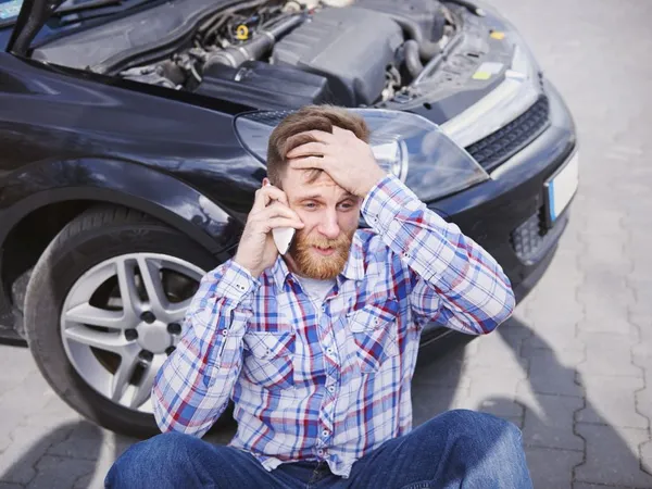 O femeie stă sprijinită de botul maşinii, după un accident, în timp ce un bărbat îi schimbă anvelopa - Foto: Freepik/CC0