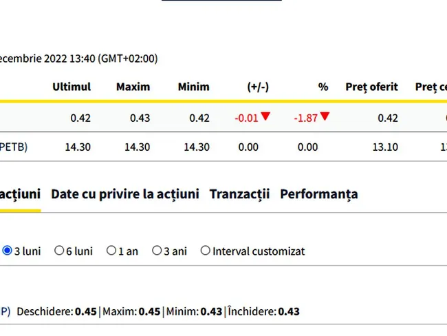 Între 22 decembrie şi 29 decembrie, evoluţia preţului unei acţiuni OMV Petrom, la Bursa de Valori Bucureşti, a fost negativă, de la 0,46 lei pe acţiune, la 0,42 astăzi, la ora 10.00.