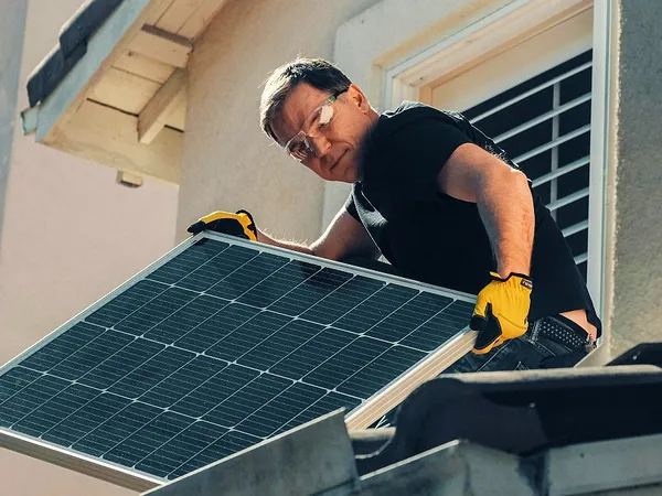 Bărbat în salopetă fixând o fotovoltaică - Foto: Freepik/senivpetro
