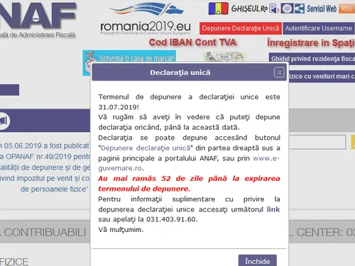 Termenul de depunere a Declaraţiei Unice este sfârşitul lunii iulie, anunţă Agenţia Naţională de Administrare Fiscală pe site-ul instituţiei, după ce Guvernul a mutat termenul de depunere, care iniţial era la mijlocul lunii martie.