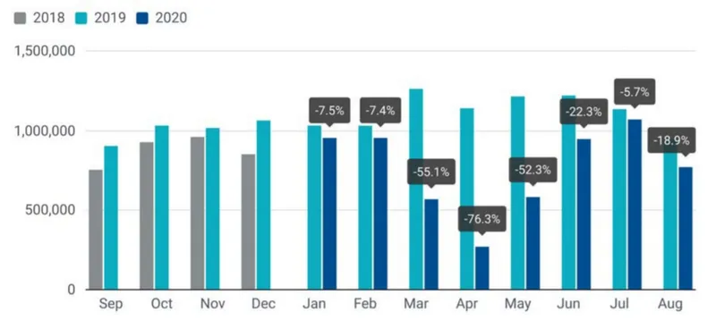 Prin urmare, trăgând linie după primele opt luni ale anului 2020, piața auto europeană s-a contractat cu 32%, față de același interval din 2019. În total, au fost înregistrate 6.123.852 de mașini noi la nivelul UE, din ianuarie până la sfârșitul lui august, ceea ce se traduce printr-o scădere a volumului de vânzări cu aproape 2,9 milioane de unități.