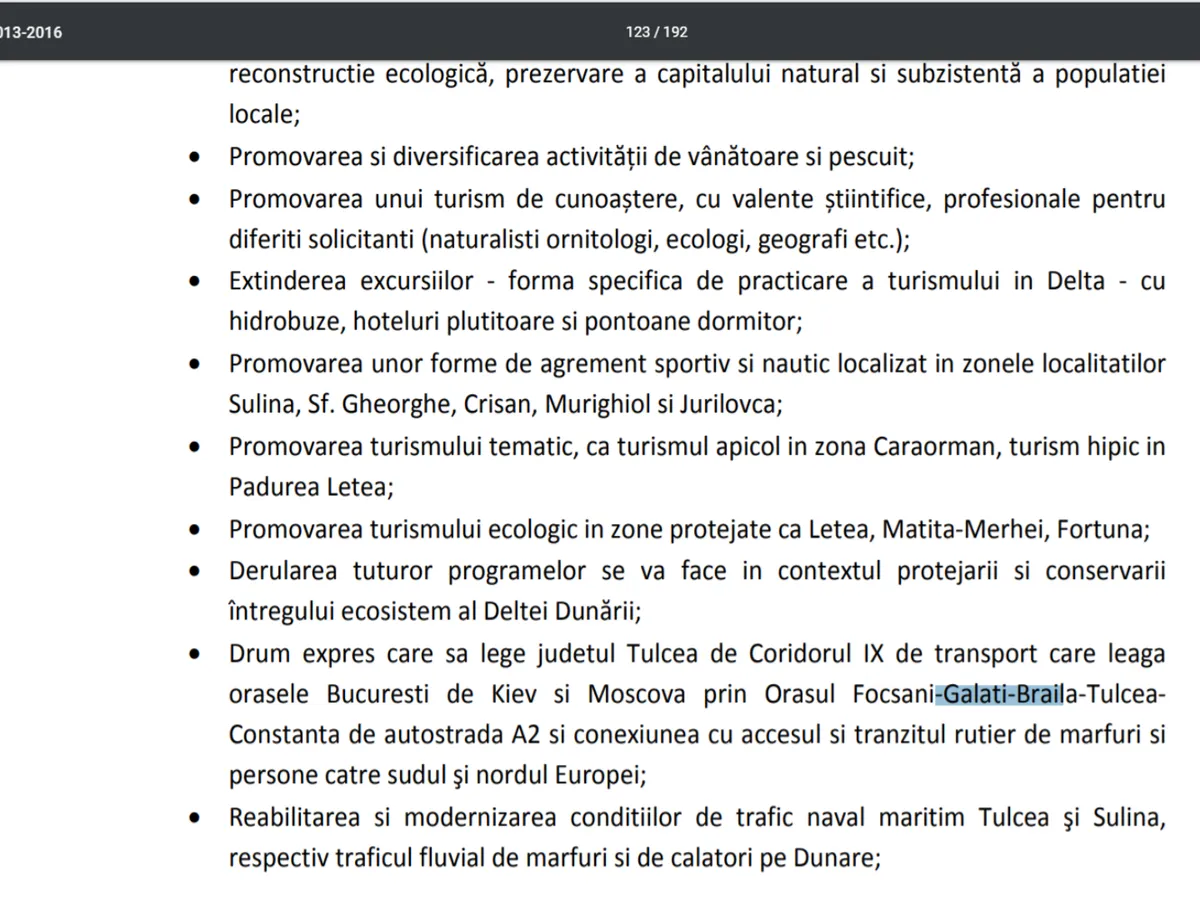 „Drum expres care sa lege judetul Tulcea de Coridorul IX de transport care leaga orasele Bucuresti de Kiev si Moscova prin Orasul Focsani - Galati -Braila - Tulcea - Constanta de autostrada A2 si conexiunea cu accesul si tranzitul rutier de marfuri si persone catre sudul şi nordul Europei”, potrivit documentului.