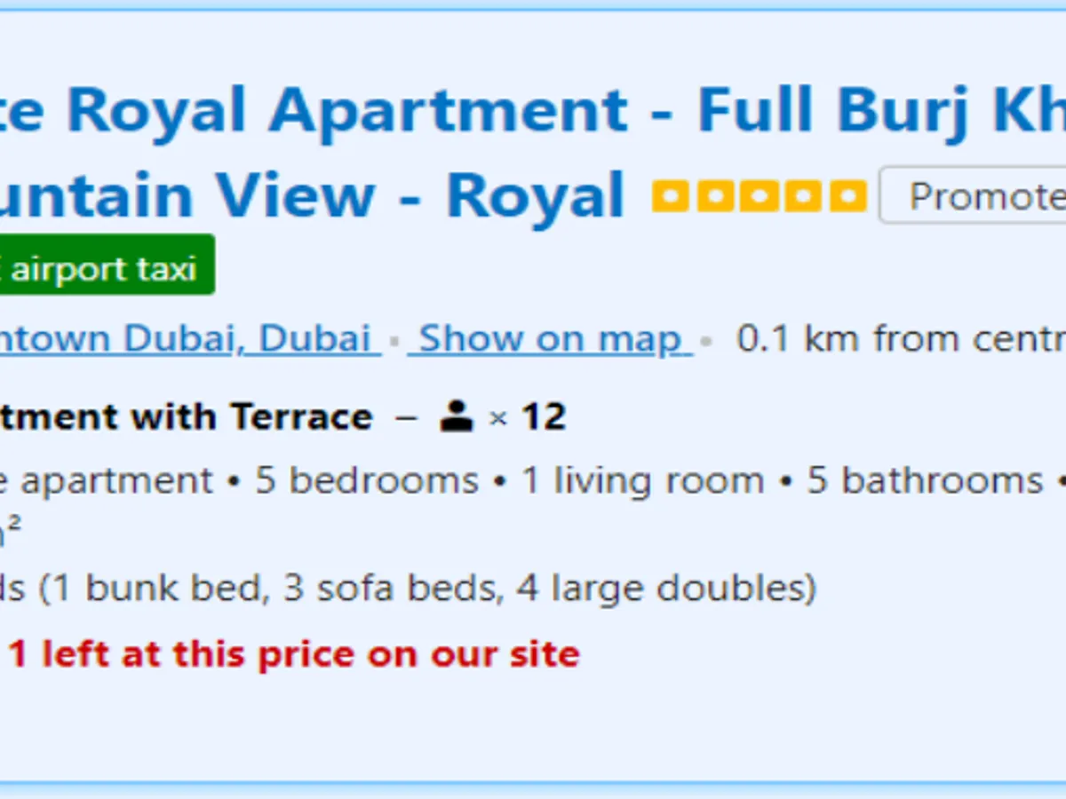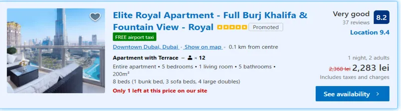 Spre comparație, la jumătate de preț, Elite Royal Apartment, cu vedere la Burj Khalif, are 5 camere și un living room. Costă doar 2.300 lei pe noapte, dar 200 mp.. Un apartament cu aceeași panoramă costă 2.100 de lei are 4 dormitoare și 160 mp.