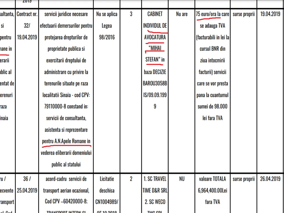 Pentru aceste servicii juridice, compania Apele Române a plătit „75 euro/oră la care se adaugă TVA servicii care se vor presta până în cuantum de 98.000 de lei fără TVA”. Nu este clar dacă aceste servicii au continuat și de la 1 ianuarie 2020, Apele Române nepublicând achizițiile publice făcute anul trecut.