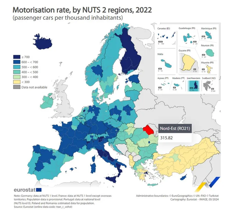 Concret, potrivit datelor Eurostat, în zona de nord-est a României, de exemplu, gradul de motorizare abia trece de 300 de mașini la 1.000 de locuitori, iar în Sud-Muntenia, de 362 de mașini la 1.000 de locuitori, cele două zone figurând în Top 10 cele mai slab motorizate regiuni din UE.