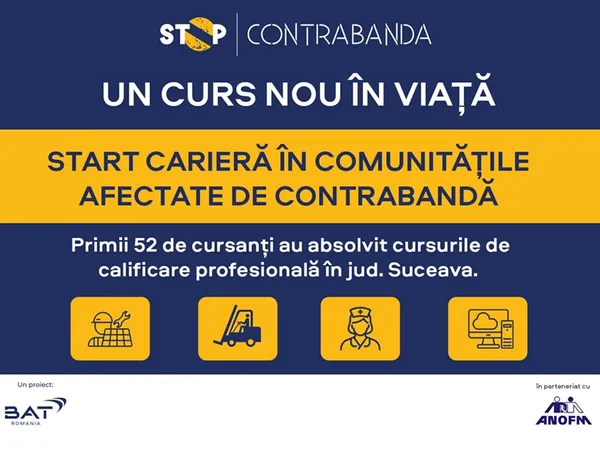 În cadrul acestui proiect, BAT susține organizarea la nivel teritorial de către ANOFM a unei serii de cursuri de calificare profesională, ca alternativă profesională viabilă în județe grav afectate de fenomenul de contrabandă. În februarie 2025, 52 de cursanți au absolvit cu succes prima serie – pilot de cursuri care asigură calificarea în meseriile de instalator de panouri fotovoltaice solare și motostivuitorist în județul Suceava.