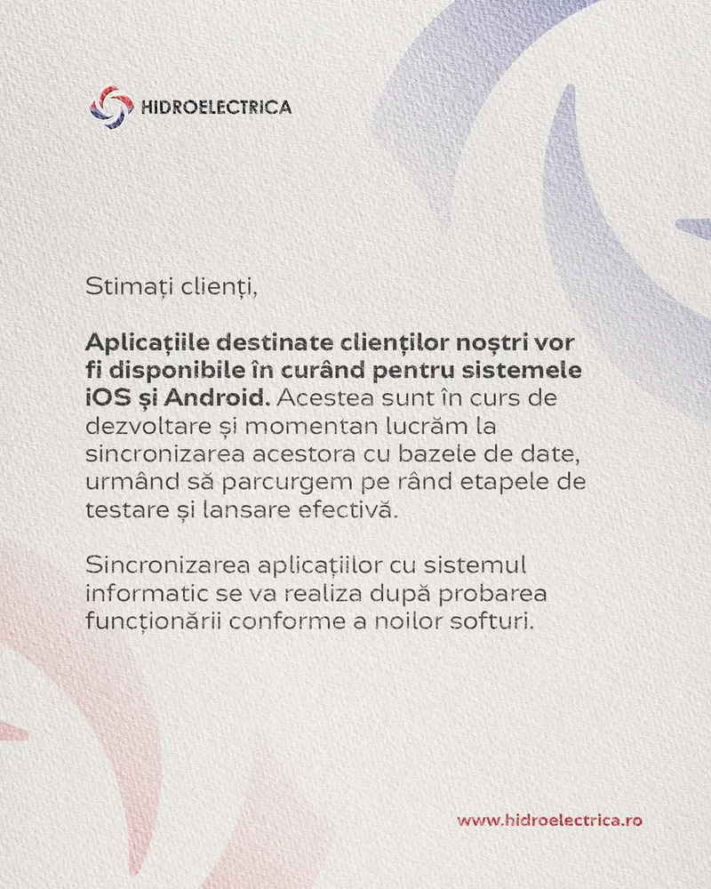 Potrivit unui anunț pus pe pagina de Facebook, Hidroelectrica spune că „aplicațiile destinate clienților noștri vor fi disponibile în curând pentru sistemele iOS și Android.