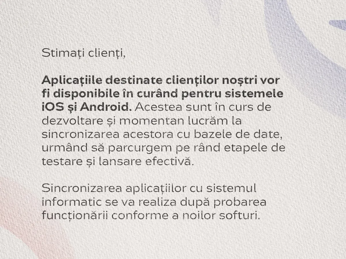 Acestea sunt în curs de dezvoltare și momentan lucrăm la sincronizarea acestora cu bazele de date, urmând să parcurgem pe rând etapele de testare și lansare efectivă. Sincronizarea aplicațiilor cu sistemul informatic se va va realiza după probarea funcționării conforme a noilor softuri.”