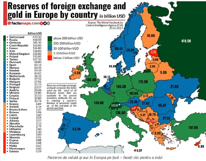 Conform raportului publicat de factsmaps.com, pe primul loc, cu cea mai mare rezervă de aur și valută se află Elveția cu 679.3 bilioane de dolari urmată de Rusia cu 418.5 bilioane USD și Germania cu 185.3 bilioane USD.