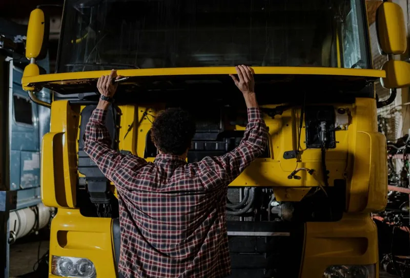 Şofer de camion uitându-se sun cutia motoare a capului-tractor - Foto: Pexels/cottonbro studio