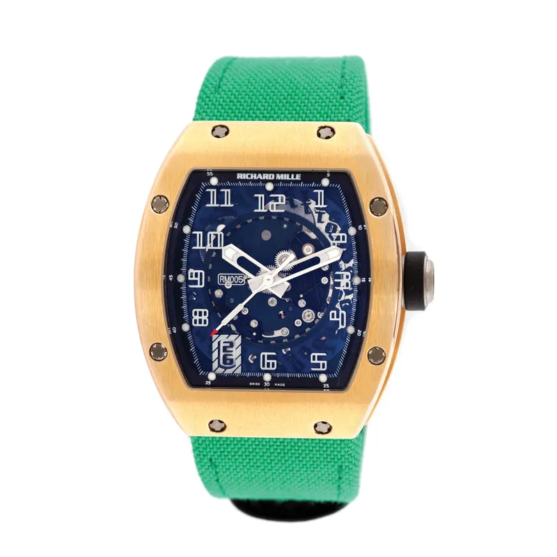 Estetica brandului Richard Mille este imposibil să nu fie remarcată, având în vedere reușita companiei din perspectivă pur inginerească. Acest lucru face ca cel de-al doilea exemplar RM-005 din licitație să impresioneze la rândul său prin cadranul skeleton și carcasa confecționată din aur roz. Modelul exclusivist, însoțit de actele de proveniență, curea de schimb și cutia originală, are prețul de pornire de 55.000 de euro.
