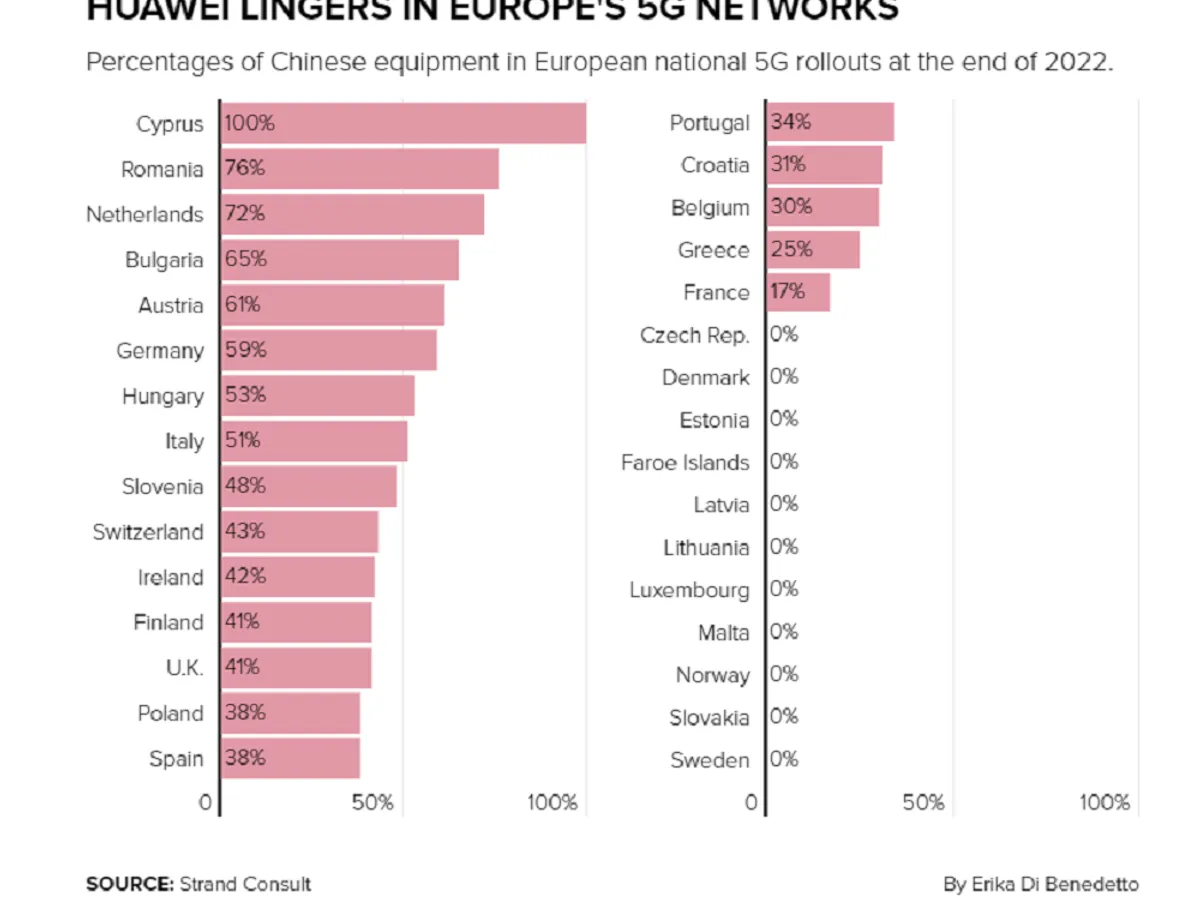 Germania se bazează pe tehnologia chineză pentru 59% din rețelele sale 5G. Alte piețe-cheie, inclusiv Italia și Țările de Jos, sunt, de asemenea, printre opt țări în care peste jumătate din rețelele 5G funcționează cu echipamente chinezești.