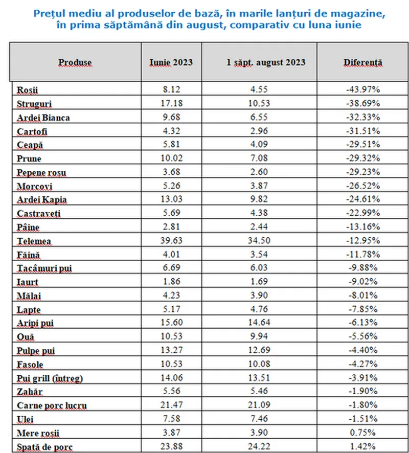 ”Preţurile medii ale alimentelor de bază vizate de ordonanţa privind plafonarea adaosurilor comerciale au scăzut cu până la 43% în prima săptămână din luna august, comparativ cu luna iunie, în marile reţele comerciale”, a anunțat Consiliul Concurenţei, relatează News.ro.