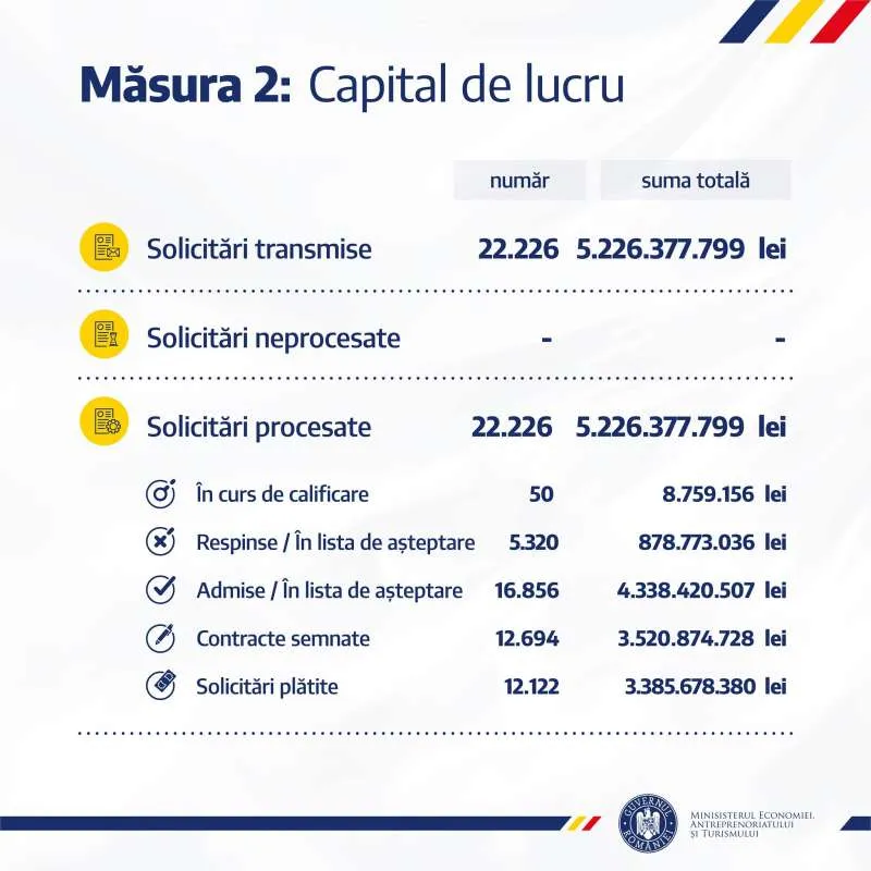 Conform datelor publicate pe pagina de Facebook a ministerului, au fost transmise 22.226 solicitări pentru această schemă de ajutor de stat din fonduri europene, valoarea totală a acestora fiind de 5,226 miliarde lei. Toate solicitările au fost procesate, potrivit MEAT.