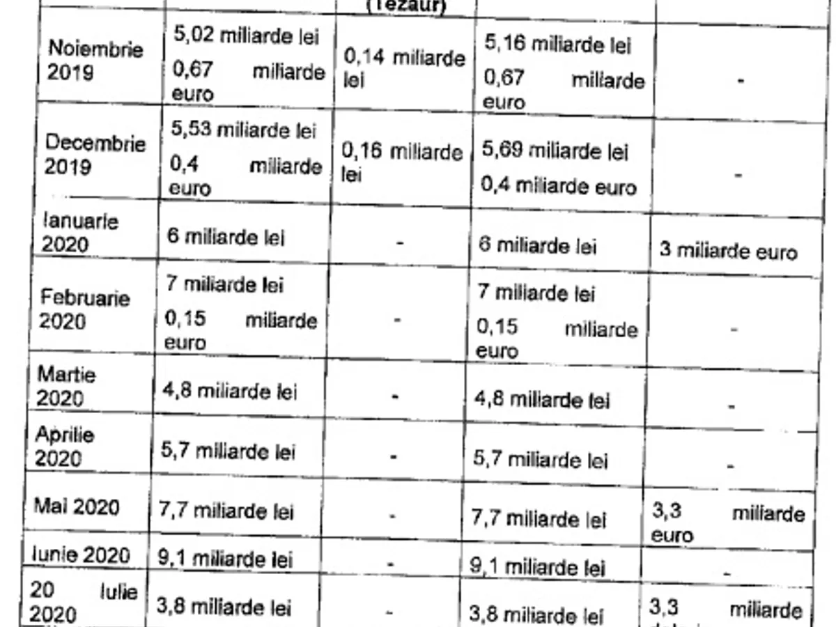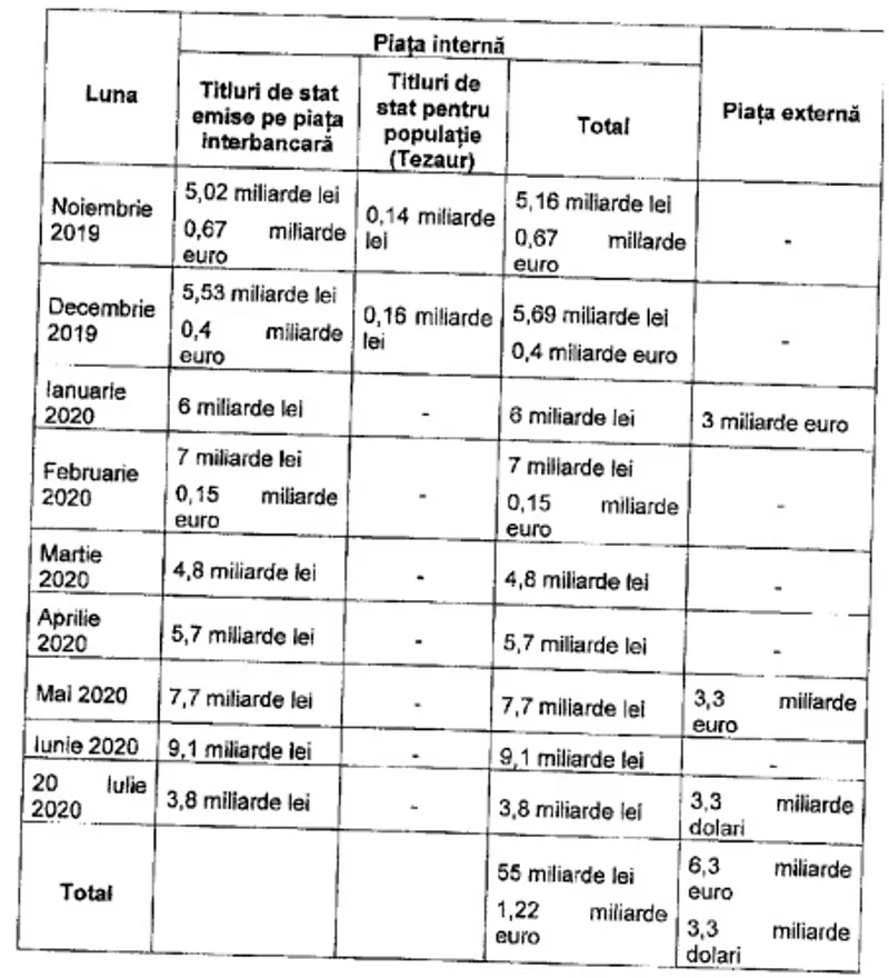 Cea mai mare sumă a fost împrumutată în luna mai a.c., la ieșirea din starea de urgență. Valoarea totală a fost de 7,7 miliarde de lei (titluri de stat emise pe piața interbancară) și 3,3 miliarde de euro de pe piețele externe.