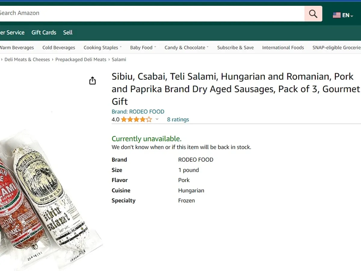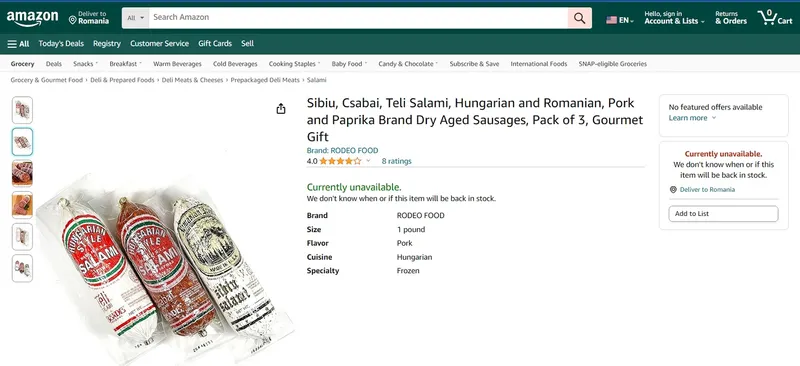 Însă până ajunge oficial, se oate cumpăra de pe Amazon cu 42$/ kg. În România, Salamul de Sibiu costă între 10 - 22 $/ kg în funcție de cine îl ambalează.