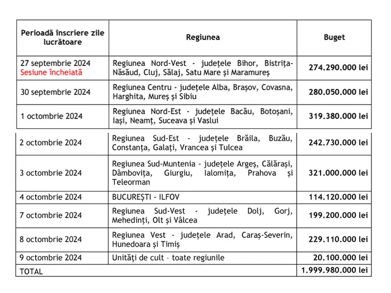 Perioada de înscriere în cadrul Programului începe la ora 10:00 și se termină la ora 23:59, pentru fiecare regiune, în limita bugetului alocat.