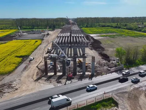 pentru pasajul peste CF101 București – Pitești DN7 (733 m) au fost ridicate pe poziție 12 grinzi prefabricate din beton din totalul de 46;