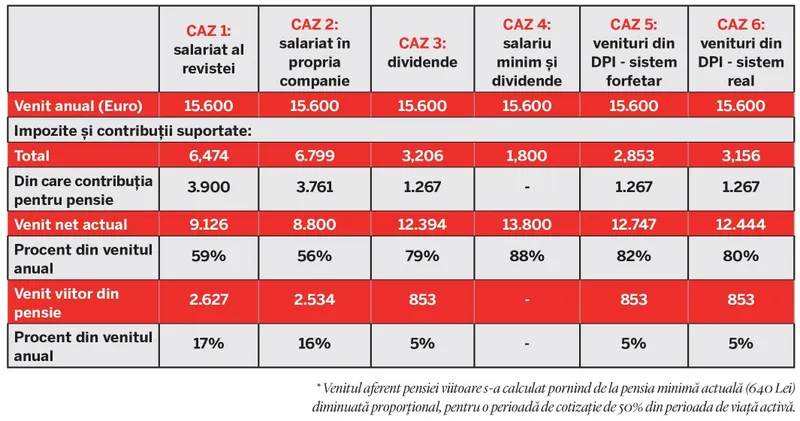 Pentru a putea analiza cele 6 cazuri, contabilul domnului Popescu a pregătit tabelul de mai jos. Prin urmare, dacă ceea ce-l interesează pe domnul Popescu este obținerea unui venit cât mai mare acum, atunci probabil cazul 4, în care venitul este încasat sub formă de dividende de la propria companie este soluția. Dar dacă domnul Popescu este interesat să-și mențină un standard similar de viață și în perioada când va fi pensionar, atunci cazul 1, în care se angajează la revista respectivă pare soluția cea mai bună.