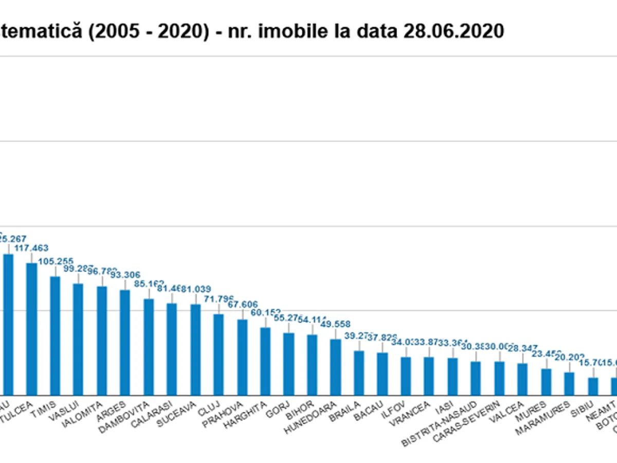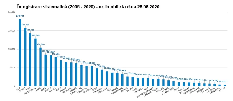 Conform ANCPI, o ierarhizare se poate face însă, în funcție de numărul de imobile înregistrate în Sistemul integrat de cadastru și carte funciară. Ultimele trei județe din clasament sunt: Giurgiu cu 10.184 imobile, Mehedinți cu 6.441 imobile și Sălaj cu 5.777 imobile, după cum se poate observa și în graficul de mai jos.