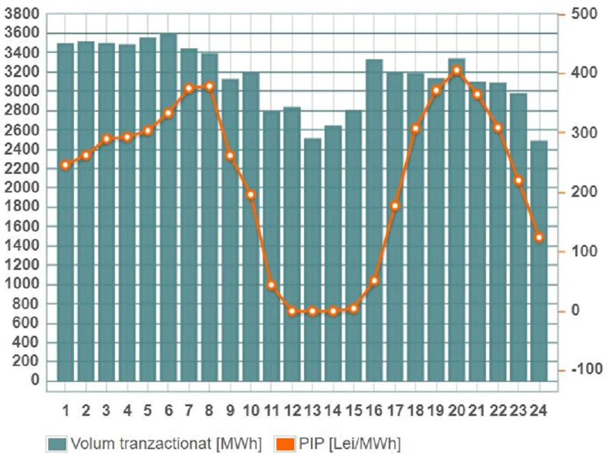 Astfel, în intervalele orare 12, 13 și 14, prețurile orare sunt de 0,1 leu/MWh, în scădere accentuată față de celelalte intervale orare ale zilei.