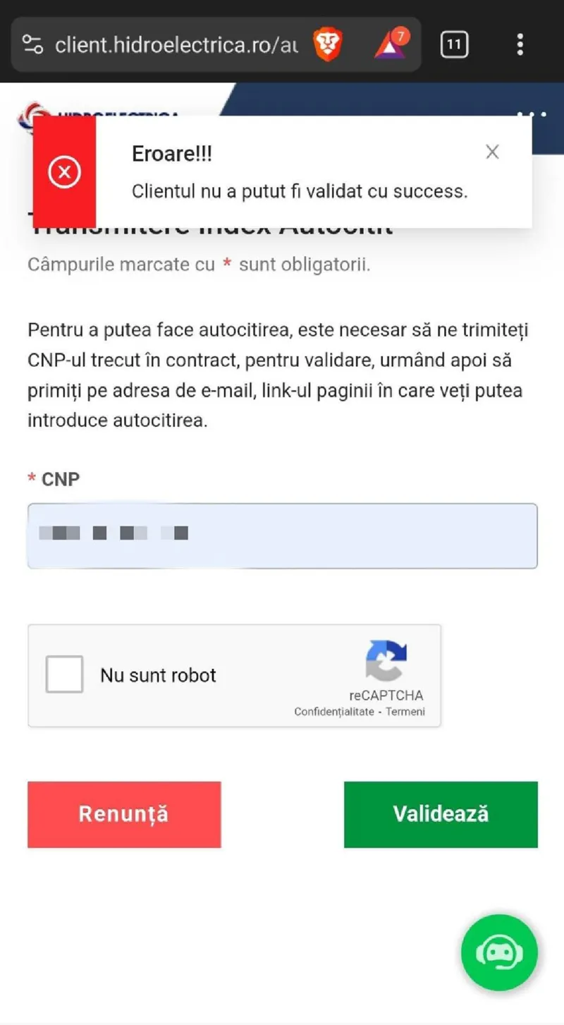 „Deși introduc CNP-ul și completez Captcha, primesc mesajul de eroare din foto atașată...