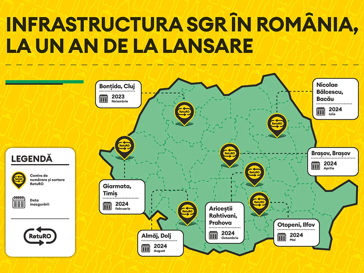 Extinderea infrastructurii RetuRO a fost esențială pentru succesul SGR. Astfel, în doar un an, au fost inaugurate șapte centre regionale de colectare și sortare în județele Prahova, Cluj, Timiș, Brașov, Ilfov, Bacău și Dolj, cu o capacitate de procesare anuală de peste 7 miliarde de ambalaje, formând o rețea care acoperă întreaga țară, de la marile orașe până la zonele rurale.