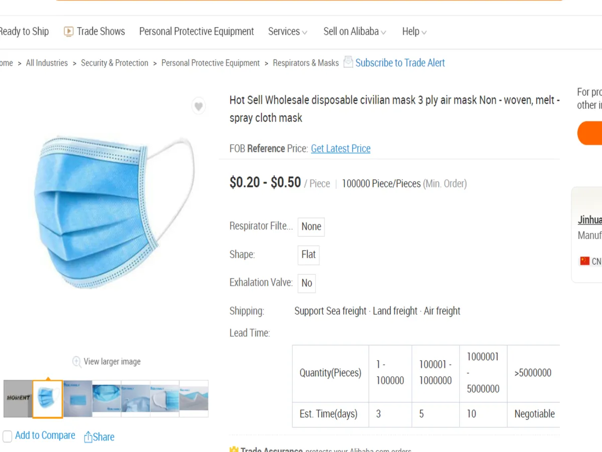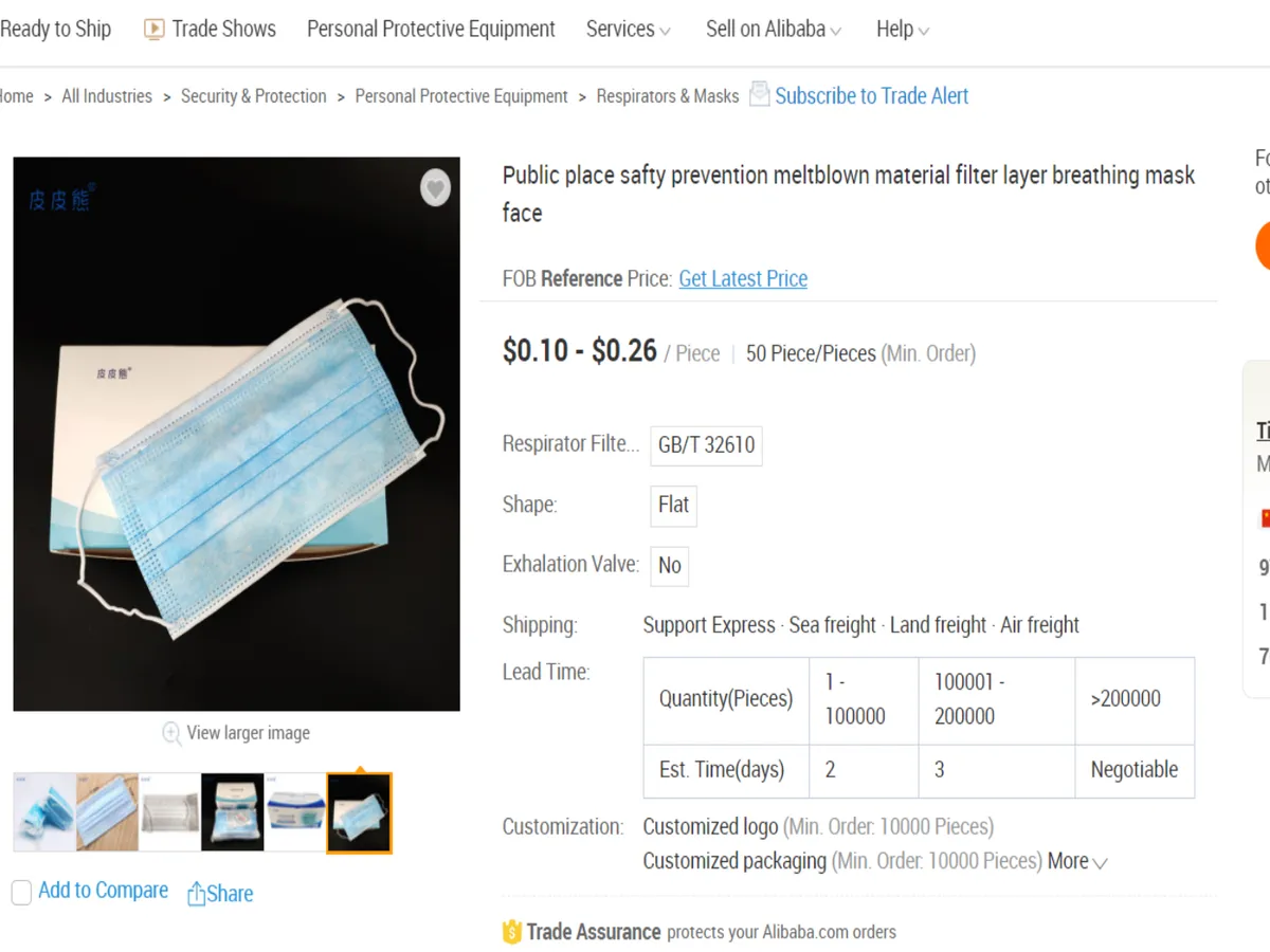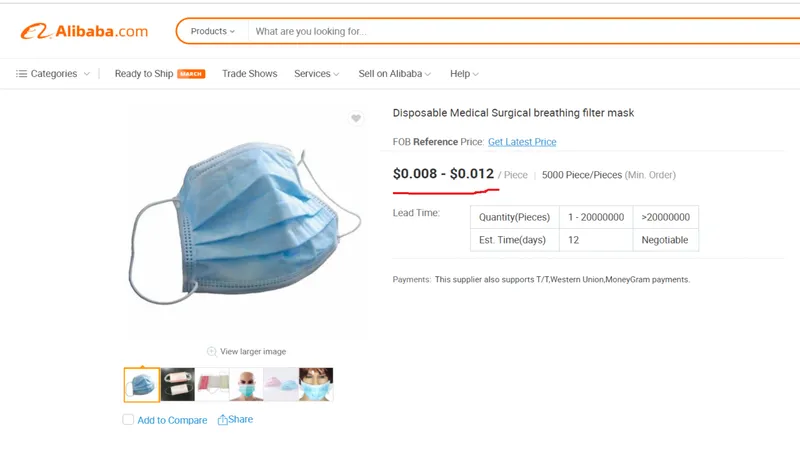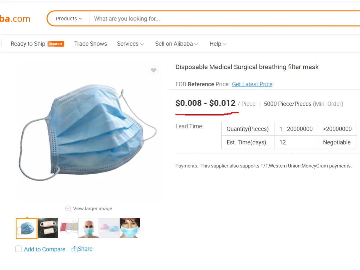 Potrivit site-ului alibaba.com, o mască chirurgicală era vândută, la final de februarie, cu un preț între 0,008$ și 0,012$ în funcție de cantitate. Site-ul alibaba.com este chinez”.