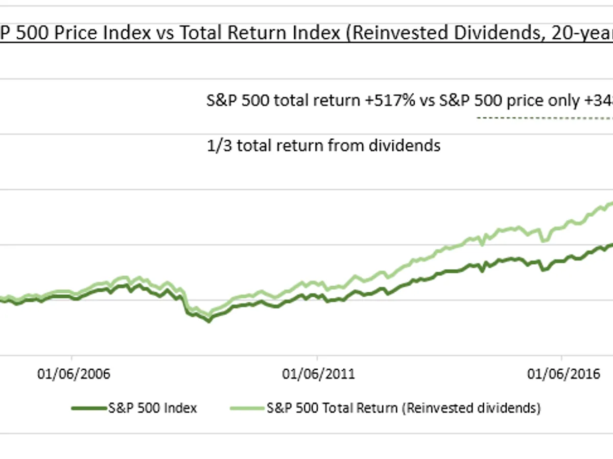 Dividendele sunt adesea trecute cu vederea, dar reprezintă cel puțin 1/3 din randamentele acțiunilor pe termen lung (a se vedea graficul), echivalentul a unui adaos de +170% pentru S&P 500 în ultimii 20 de ani, subliniind puterea de compunere a reinvestirii câștigurilor acumulate (dividendele dumneavoastră cumpără mai multe acțiuni, ceea ce crește următorul dividend și așa mai departe).