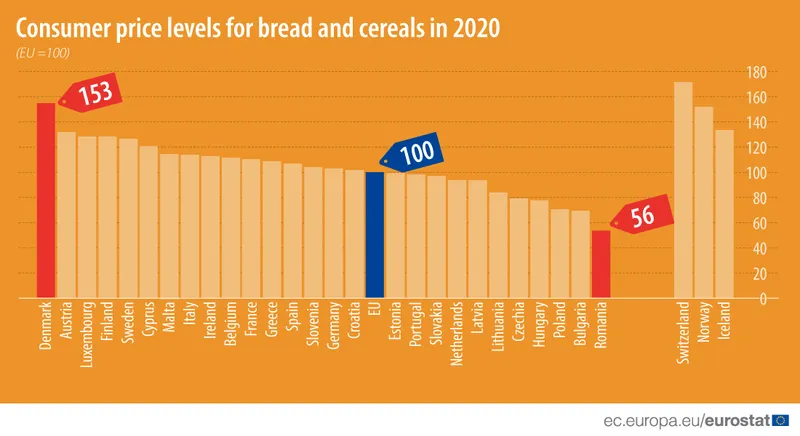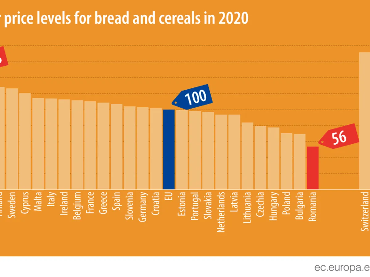 Potrivit Eurostat, dacă media europeană a prețurilor la pâine și produse din cereale este 100, prețurile din România reprezintă doar 56% din mediad UE. În Danemarca, prețurile sunt la 153% din media europeană.