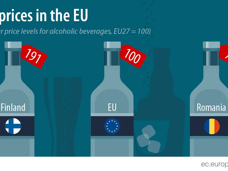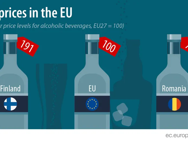 Datele Eurostat arată că, dacă indicele prețului mediu la alcool în UE este considerat 100, nivelul din România este 76, adică cu 24% sub media europeană. În schimb, în Finlanda indicele mediu este 191, adică aproape dublu față de UE.