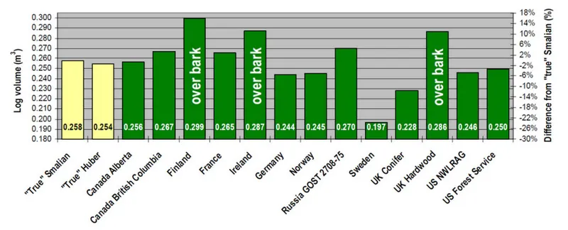 Comparație între exprimarea volumului aceleiași piese de lemn rotund în accepțiunea diferitelor standarde naționale aplicate în diferite țări