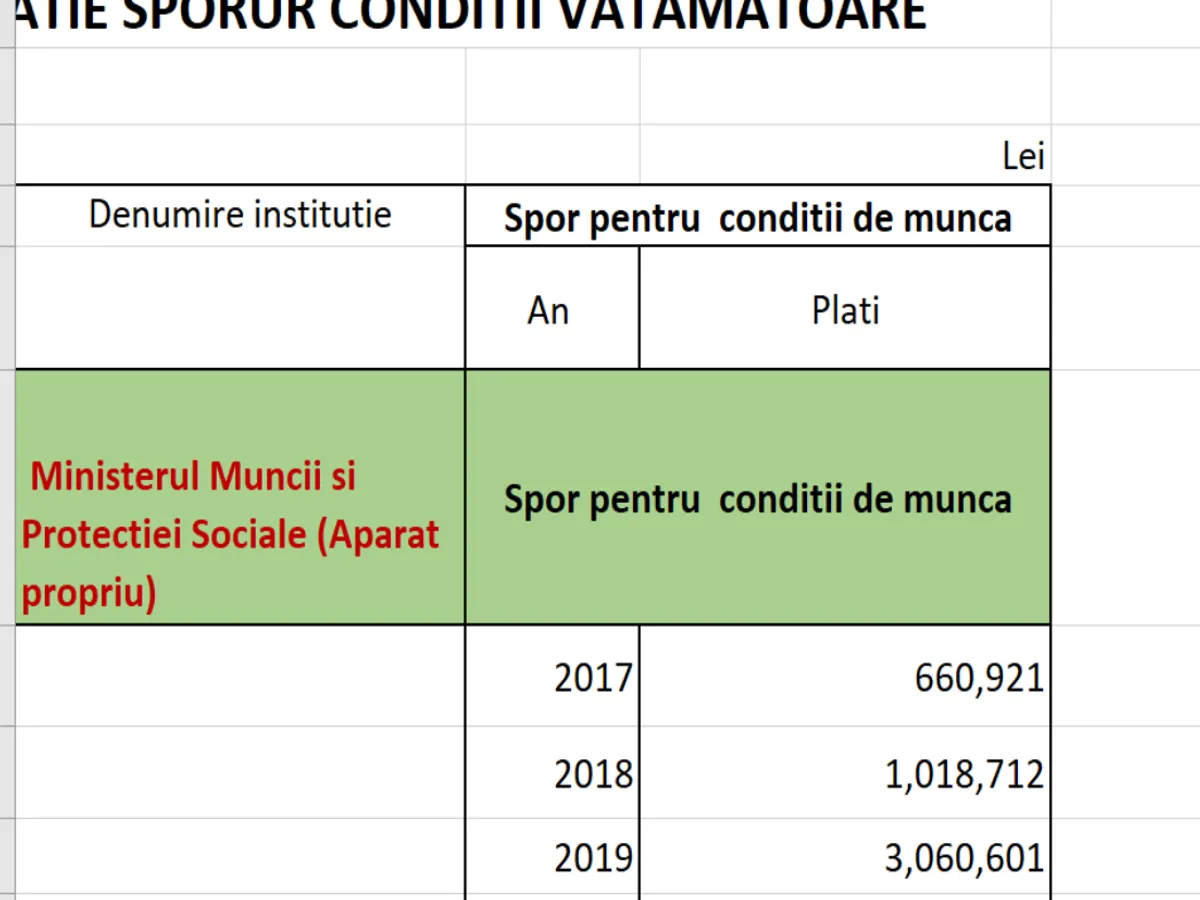 Potrivit cifrelor oficiale, între 2017 și 2020 s-au acordat, în cadrul instituțiilor subordonate Ministerului Muncii și în aparatul de lucru, sporuri pentru condiții vătămătoare și confidențialitate, în valoare de 174.573.553 lei. Dintre acestea peste 6,6 milioane s-au acordat în 2017, 8,7 milioane în anul 2018, 79 de milioane în anul 2019 și 80 de milioane în 2020.