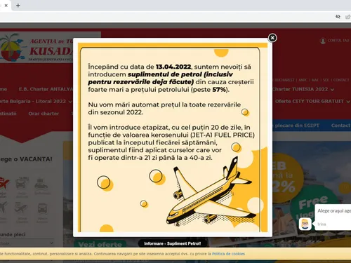 Un pop-up de pe site-ul agenției Kusadasi anunță vizitatorii că „Începând cu datade 13.04, suntem nevoiți să introducem suplimentul de petrol (inclusiv pentru rezervările deja făcute) din cauza creșterii foarte mari a prețului petrolului (peste 57%)”.