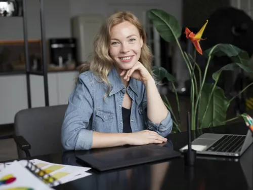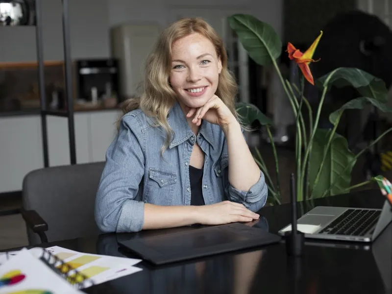 Tănără femeie zâmbitoare stând la birou - Foto: Freepik/drobotdean