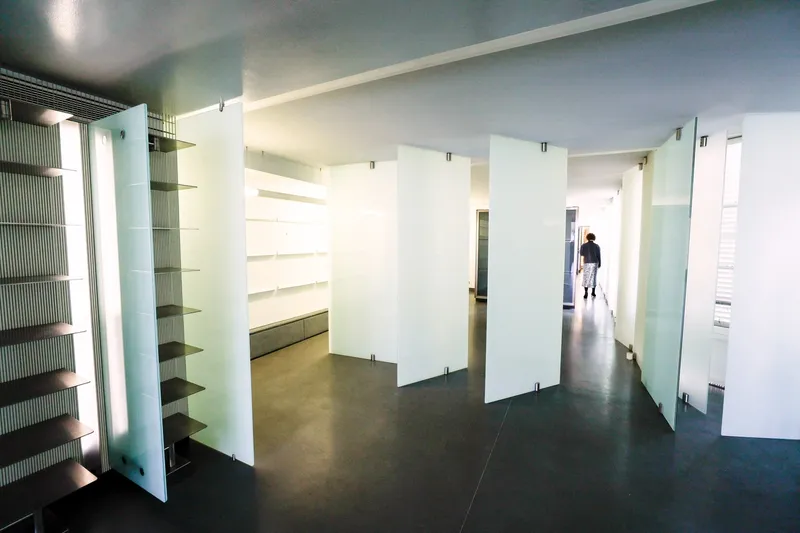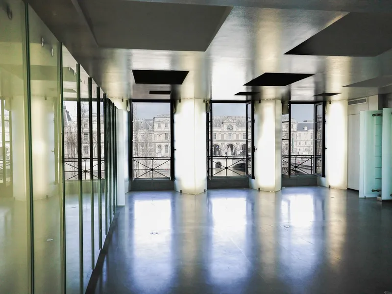 Situat într-o clădire din secolul al XVII-lea, pe Quai Voltaire, în inima Parisului istoric, cu vedere la Sena şi la Muzeul Luvru, apartamentul a fost complet refăcut de către designer într-un stil futurist, cu podele din beton şi panouri din sticlă sablată.
