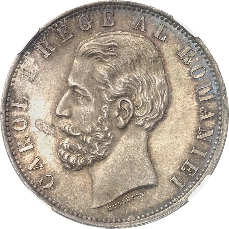 Capul lui Carol I (1866-1914). 5 lei. Anul 1885, București. pe verso: Scut încoronat, ținut de doi lei. Are un preț de plecare la licitație de 8.000 de euro.