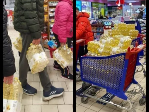 Pe rețelele de socializare apar de câteva zile imagini cu cozi interminabile în magazine, în care oamenii cumpără baxuri întregi de ulei.Mai multe imagini au fost suprinse, în diverse magazine din România, în seara zilei de vineri, înfățișând oameni cumpărând masiv ulei alimentar.